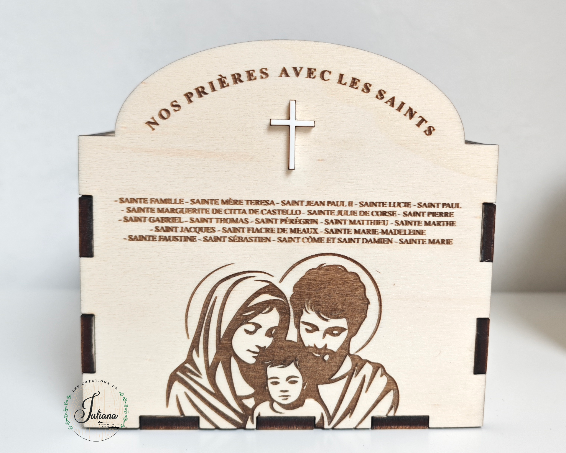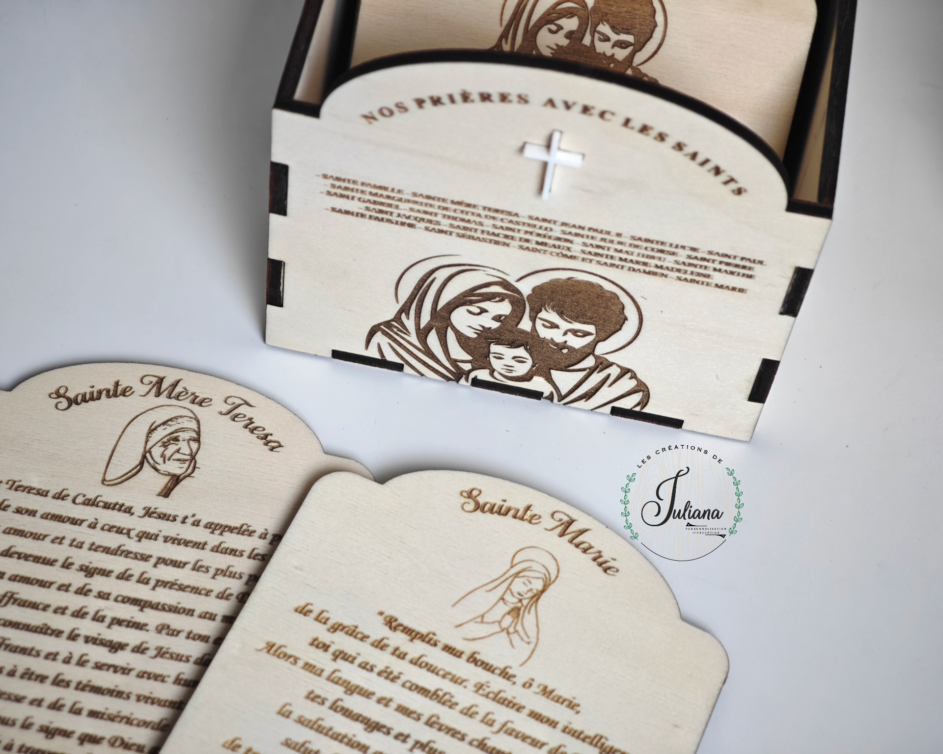 Boîte à prières en bois, composée de 20 cartes en bois avec une prière sur chacune d’un Saint différent.