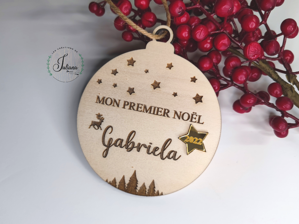 Boule de noël à suspendre dans le sapin, en bois brut avec la petite étoile gravée 2022 en plexi miroir doré + le prénom en personnalisation, design réalisé par les créations de Juliana.