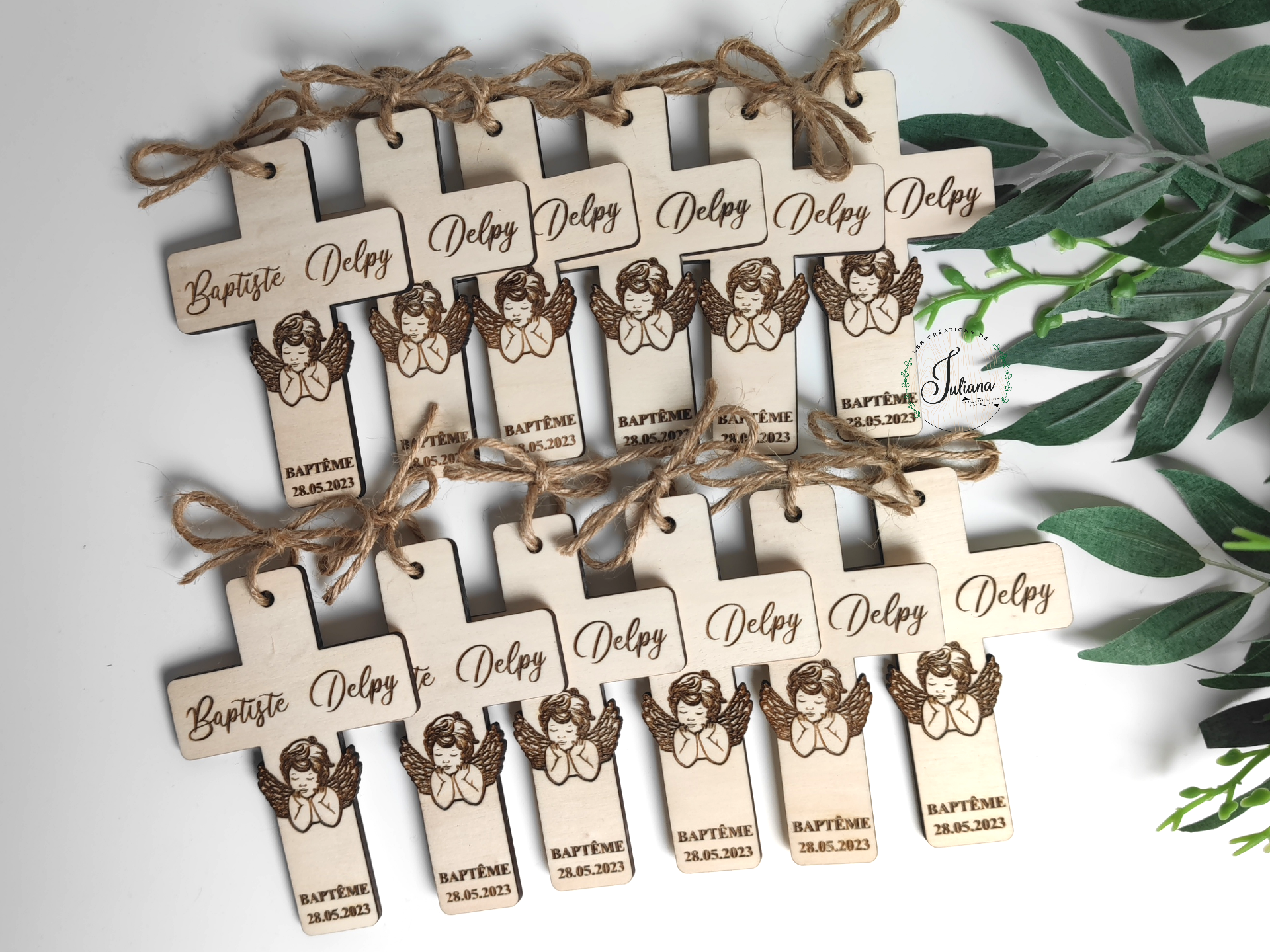 Croix personnalisée de 12cm, en bois, personnalisé au prénom de l’enfant, et à la date de baptême, idéal pour offrir en cadeau aux invités.