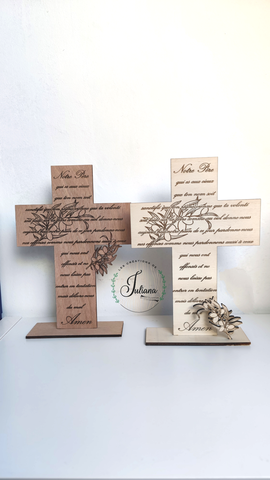 Croix en bois, une décoration à poser, avec en gravure la prière Notre Père, des branches d’olivier pour symboliser la paix & la victoire.