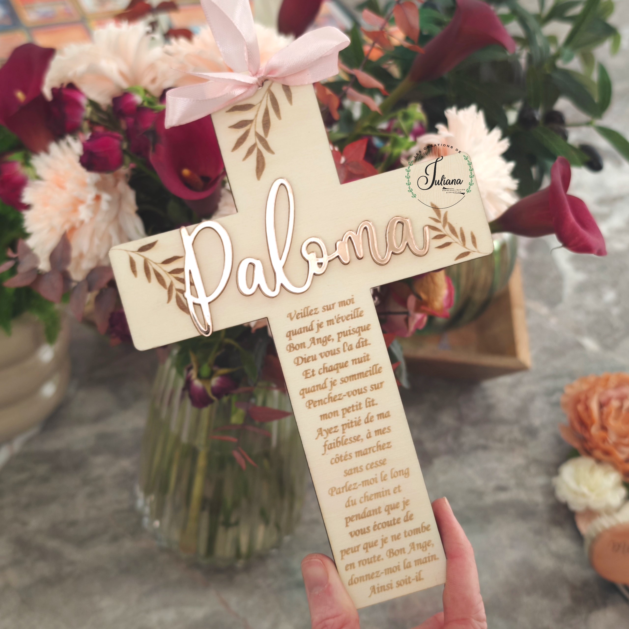 Croix en bois personnalisée au prénom de l’enfant avec prénom en relief de la couleur de votre choix.
