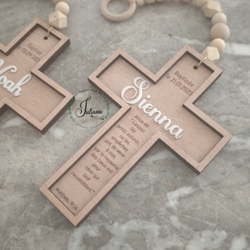 Modèle original de croix doublée et perlée, avec le prénom de l’enfant en relief plexi de la couleur de votre choix.