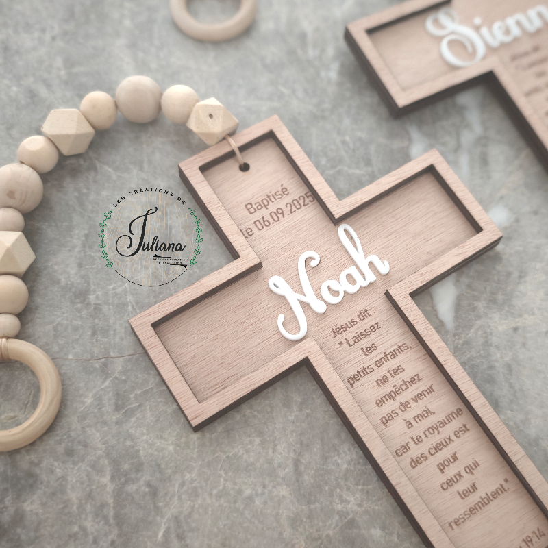 Un verset biblique est délicatement gravé, ainsi que la date de baptême qui est optionnel en haut de celle-ci.
