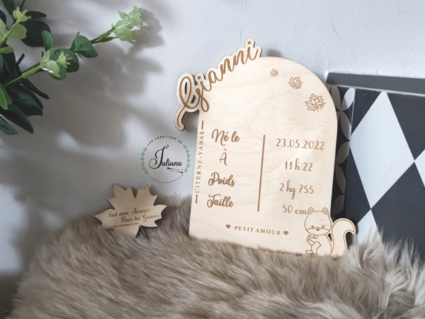 Voici la plaque naissance, qui rappelle toutes les mentions de naissance de bébé, son prénom en forme d’arche en haut a gauche, son poids, sa taille, son jour de naissance, son heure de naissance, ainsi que son nom de famille qui est gravé à la verticale sur le côté gauche de la plaque.